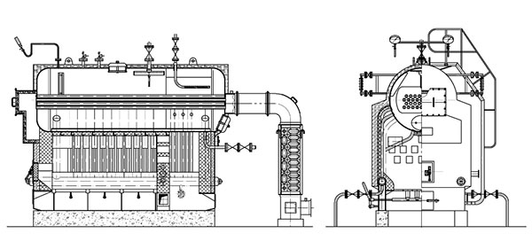 1、鍋爐型式為臥式快裝鍋爐、工質(zhì)自然循環(huán)。 該鍋爐換熱系統(tǒng)由鍋筒、左右集箱、水冷壁組成,主要受熱面有爐膛水冷壁、部分鍋筒和鍋筒內(nèi)對(duì)流管束。